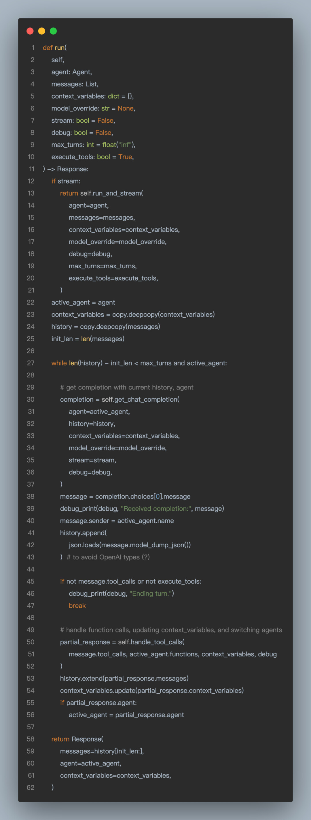 工具调用(Tool Calls):Swarm允许代理调用Python函数,并支持通过函数返回值更新上下文变量和进行代理交接,这增加了框架的灵活性和可定制性。