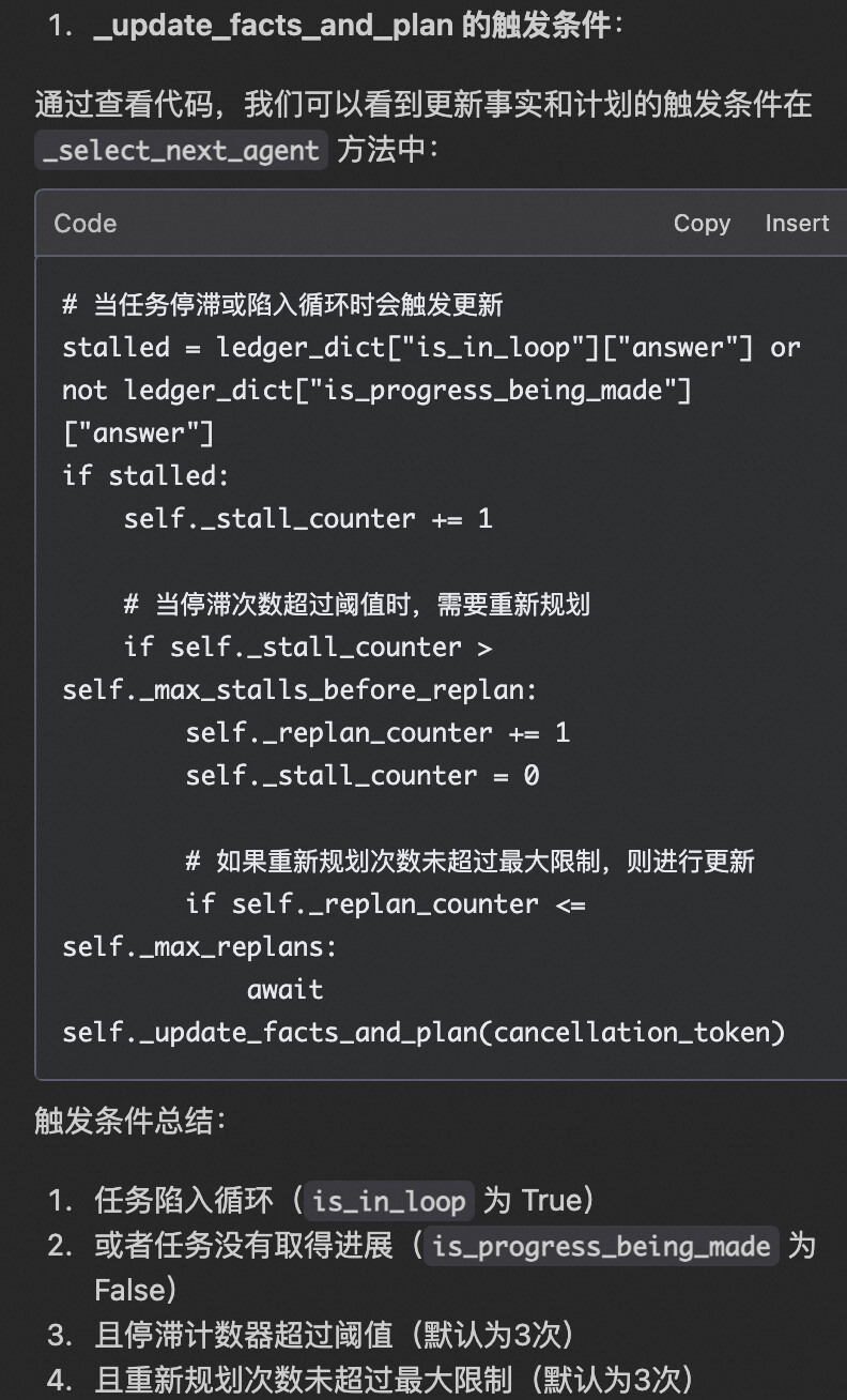 - 我们是否在取得进展?(如果刚开始,或最近的消息在增加价值,则为True。如果最近的消息显示陷入循环,或有重大障碍阻止成功,如无法读取必需文件,则为False)