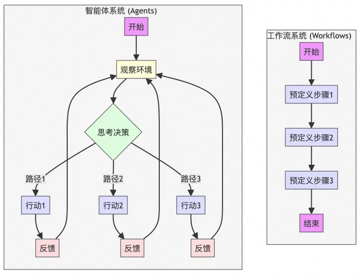 必要时使用智能体系统: 从Workflow到Agents,Workflow为明确定义的任务提供可预测性和一致性,而当大规模需要灵活性和模型驱动的决策时,可以考虑Agents。