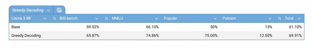 我也确实使用 do_sample 将贪婪解码应用于模型 Llama 3 8B,以检验能否在基础问题上获得提升。结果如下:
