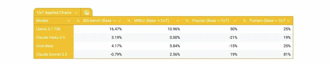 我们在这里也看到了这一点,在简单的问题上,CoT 带来的提升有限。