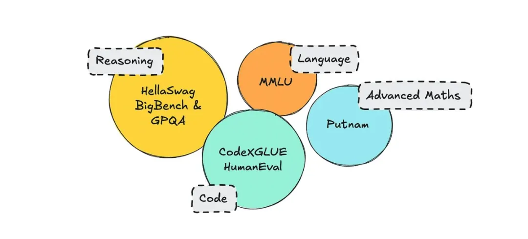 在引入模型时,通常会附带评估指标。目前有几种流行的评估指标,如 MMLU(语言理解)、BigBench(推理)、HellaSwag(常识推理)等。