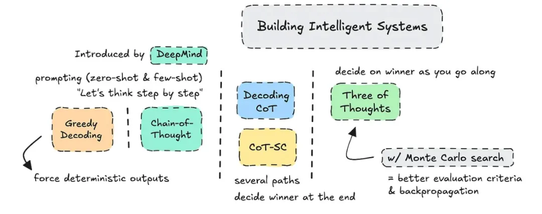 CoT 这个词是 DeepMind 在 2022 年提出的,只在提示中使用。最新的论文探索了结合蒙特卡洛搜索(Monte Carlo Search)和无需提示的 CoT 的「思维树」(ToT)。