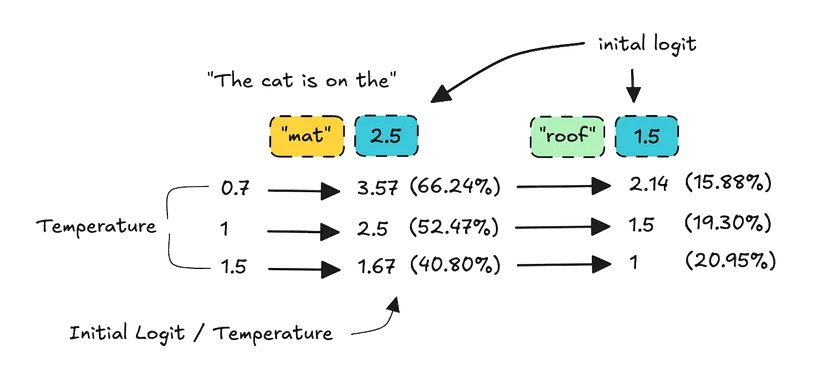 现在,我们并不总是可以访问商业 API 的所有这些设置,但我们可以访问 temperature。从技术术语上讲,temperature 的意思是:当我们将其设置为高时,我们可以缩放 logit,从而增加低概率 token 被选中的机会。如下所示: