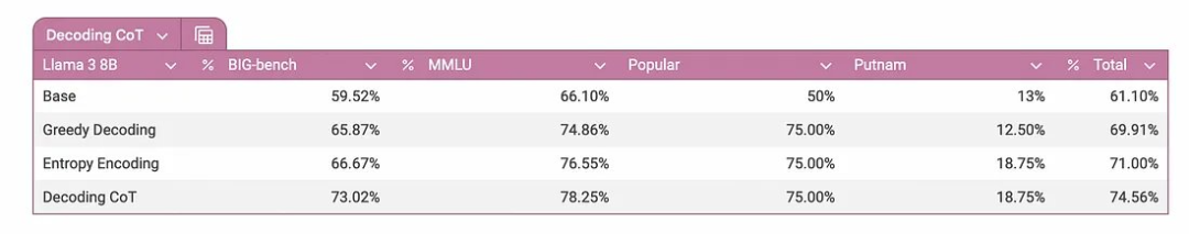 从上面的结果可以看到,与其他方法(例如 Entropy)或仅使用贪婪解码来处理此特定模型相比,使用 Decoding CoT 显然产生了最佳结果。