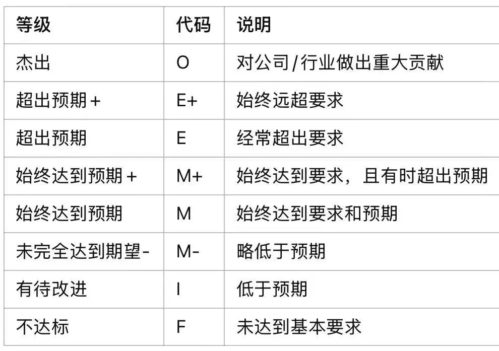 如果员工得到“M-”(未完全达到期望) 或“I”(有待改进) 的评分,这可能会导致他们被纳入绩效改进计划 (PIP),或者拿着离职补偿金走人。