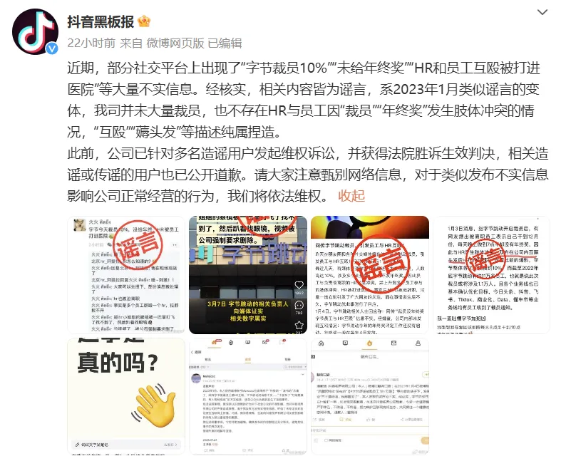 3 月 14 日,抖音黑板报官方辟谣称,近期,部分社交平台上出现了“字节裁员 10%”“未给年终奖”“HR 和员工互殴被打进医院”等大量不实信息。