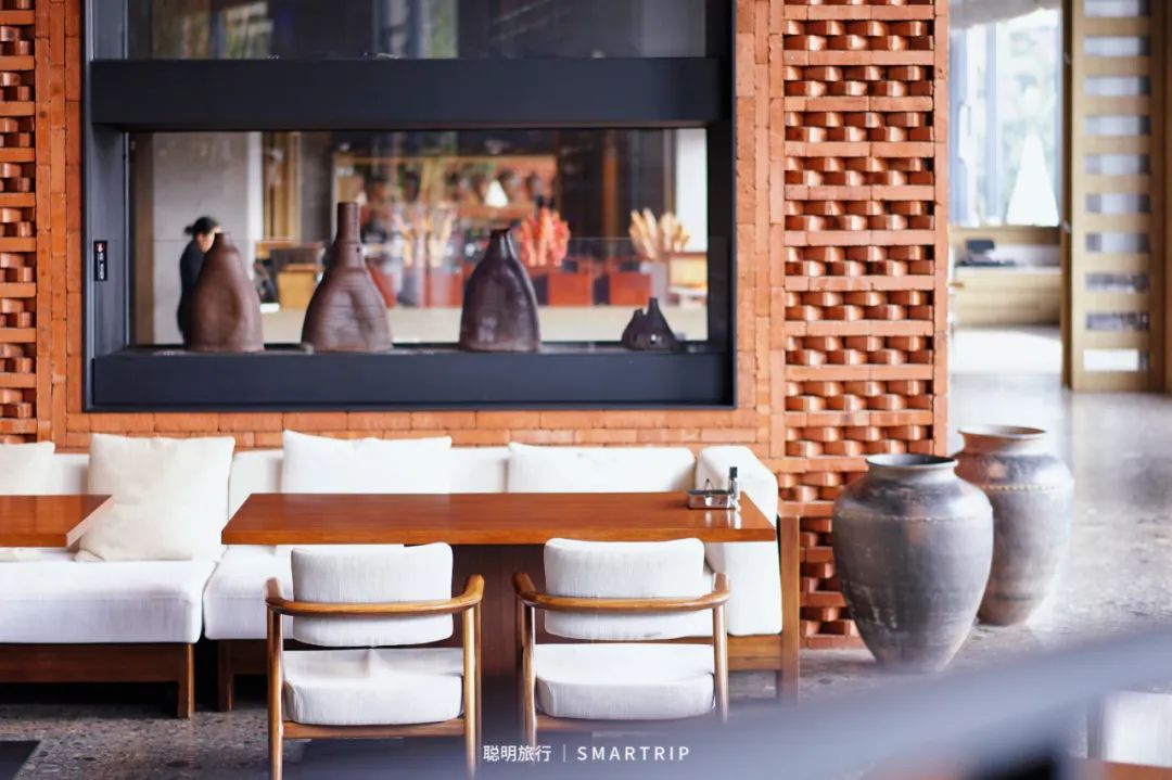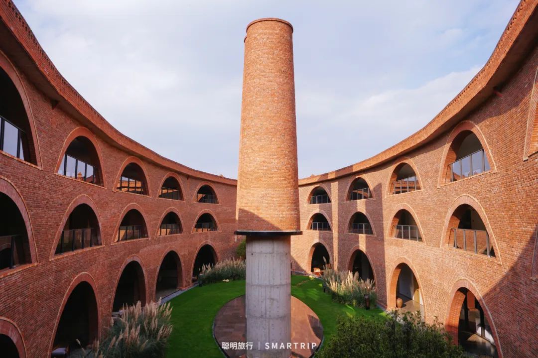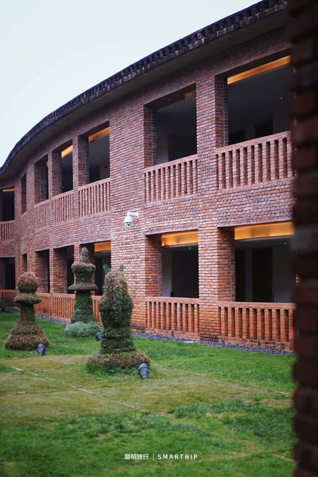 弥勒美憬阁由5栋环形红砖建筑组成,共235间客房和套房,室内设计由CCD主理,大地色为基调,穿插以原木、石材、印染和织物,将云南的本地材质和匠艺娓娓道来。