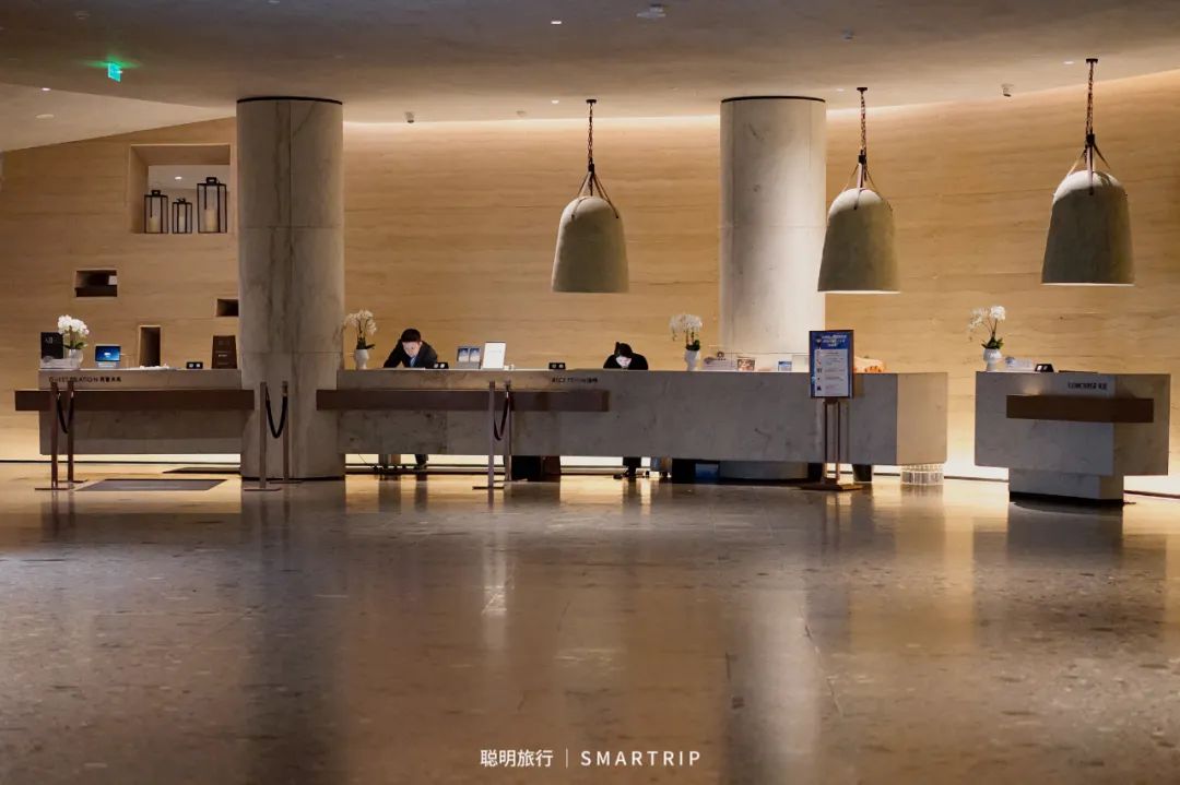 大堂另一侧,透过弧形落地窗,是由烟囱、草坪、芦苇和镜面水池组成的椭圆形中庭。