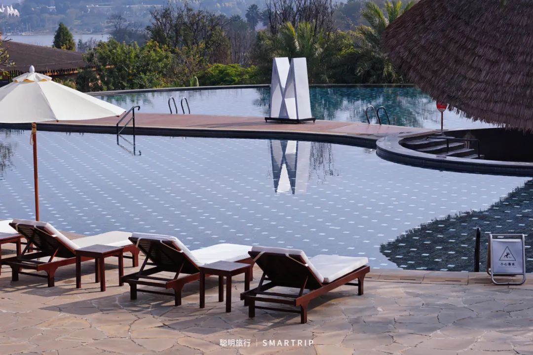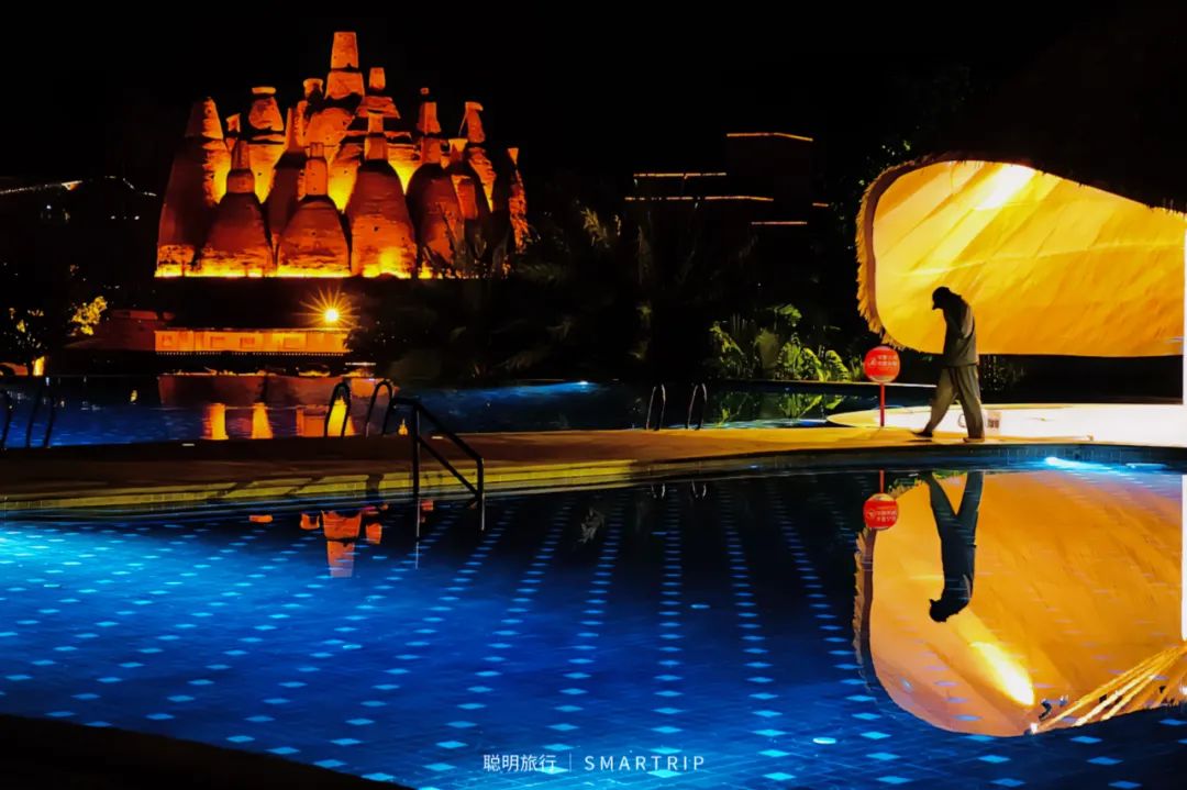 | 无边泳池 |1300平无边泻湖泳池,是整个酒店的最美出片点,对面的万花筒在白天是背景,到了晚上水中的倒影美轮美奂。