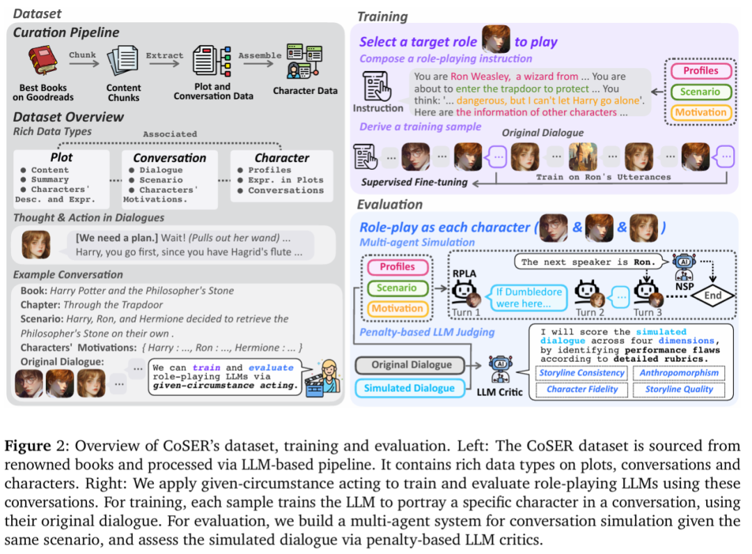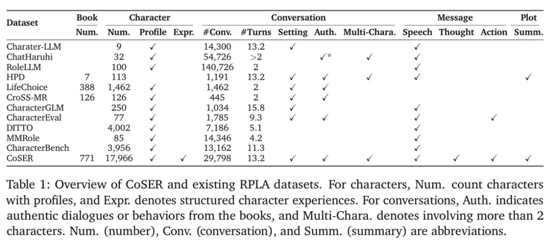 上图将 CoSER Dataset 与之前的数据集进行了比较。概括来说,CoSER 的独特之处在于: