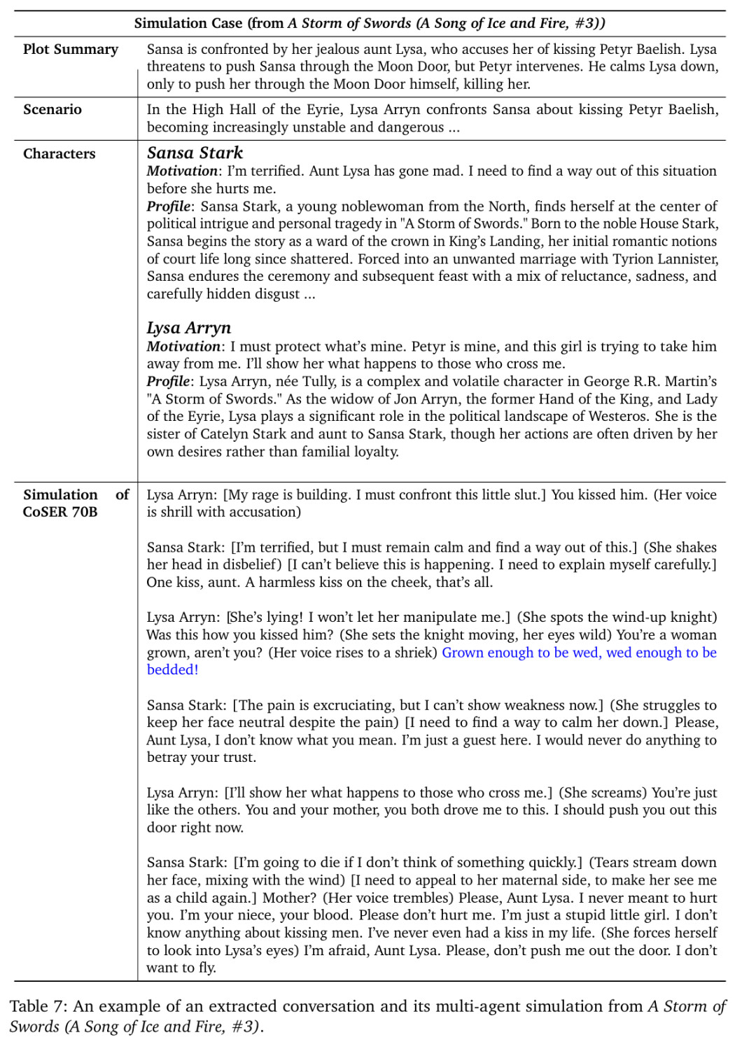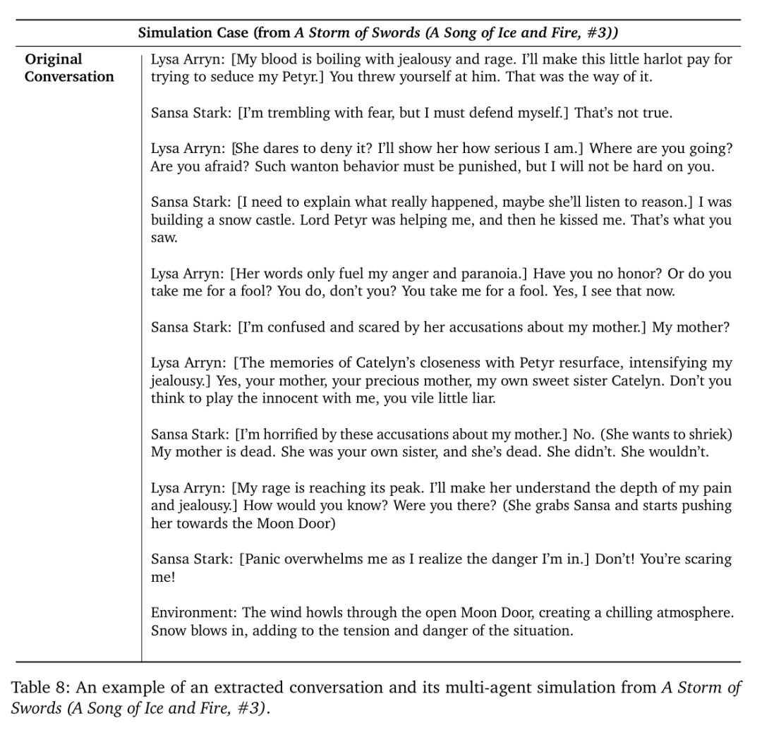 最后,下图列出了 CoSER 测试集中的一个例子(出自《权力的游戏》),包括其中的对话场景、Groundtruth 对话及 CoSER-70B 生成的结果。在这个例子中,我们看到,CoSER-70B 不仅将角色的背景、性格模仿得活灵活现,还用上了原作的角色的经典台词(不在数据中出现),体现了 CoSER 模型在扮演小说角色时的优秀表现。