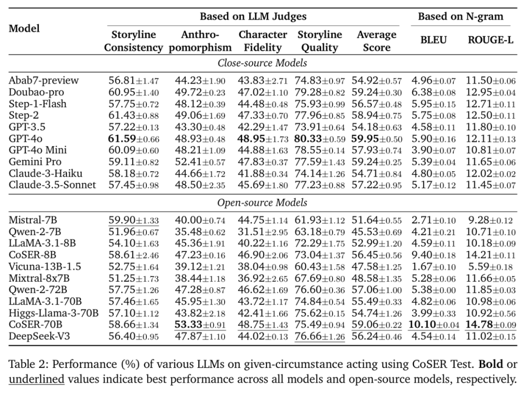 在本文提出的 GCA 评估中,CoSER-70B、GPT-4o、Step-2、Doubao-pro 取得了最好的表现,其中,CoSER-70B 的表现远超其他开源模型。进一步,本文在实验中还汇报了 BLEU、ROUGE-L 等指标来比较模型生成对话与 Groundtruth 对话的一致性,在这一指标上 CoSER-70B 超过了所有的现有模型。