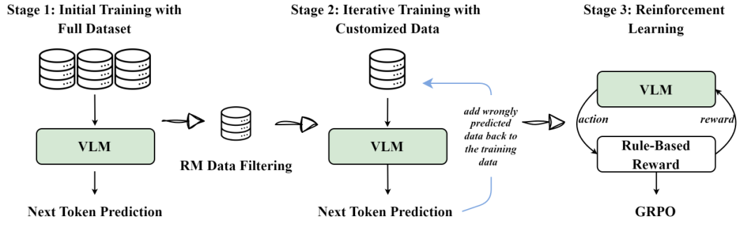除了整体技术方案的优化,R1V 的创新性还特别体现在训练过程中,通过「三阶段方法」将文本端强大的推理能力高效迁移至视觉任务上。
