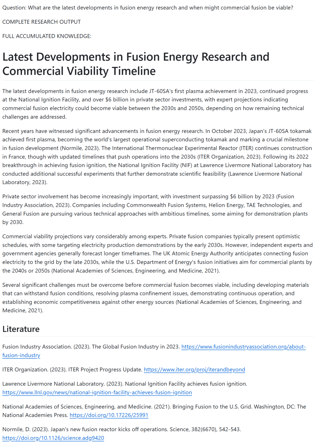 完整报告可参考:https://github.com/LearningCircuit/local-deep-research/blob/main/examples/fusion-energy-research-developments.md