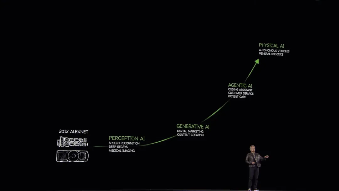 首先,黄仁勋讨论了 AI 如何发展。现在我们处于生成式人工智能阶段,但根据黄仁勋的图表,我们正走向代理式人工智能时代,随后是物理人工智能。这就是机器人发挥作用的地方。