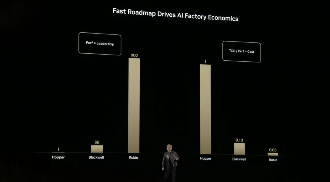黄仁勋展示了 Vera Rubin NVLink576 的外观和参数,并宣称 Rubin 的性能可达 Hopper 的 900 倍,而 Blackwell 是 Hopper 的 68 倍。