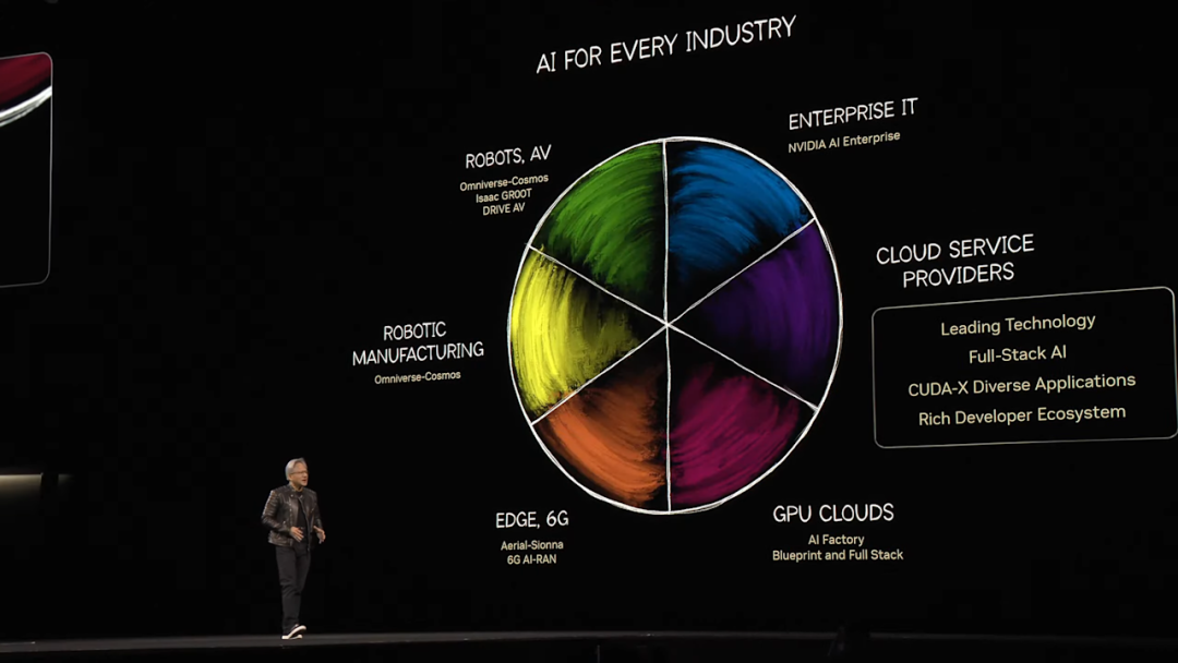 他转向自动驾驶汽车(AV)——这通常是人工智能领域最大的领域之一。他指出,几乎每家自动驾驶汽车公司都在使用英伟达的技术,从特斯拉到 Waymo,从软件到硬件,都试图推动该行业向前发展。