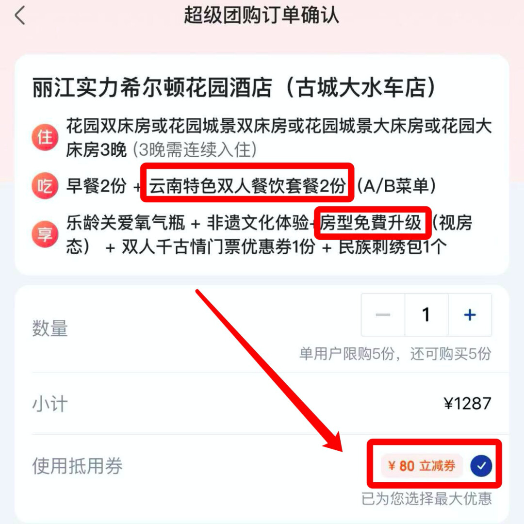 套餐可以用满1000-80的券,券后402元/晚。亮点是可以视房态免费升级至城景房,还包含云南特色双人餐等。