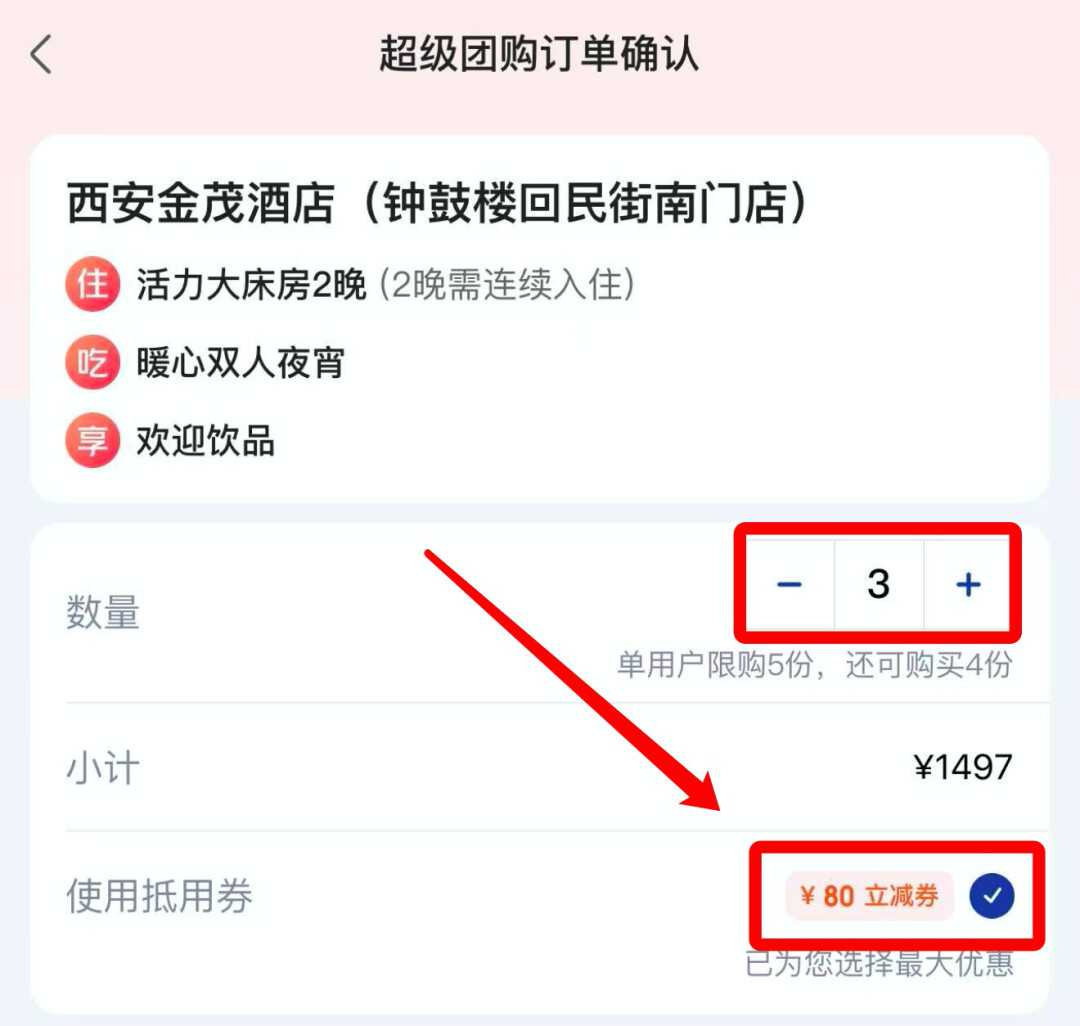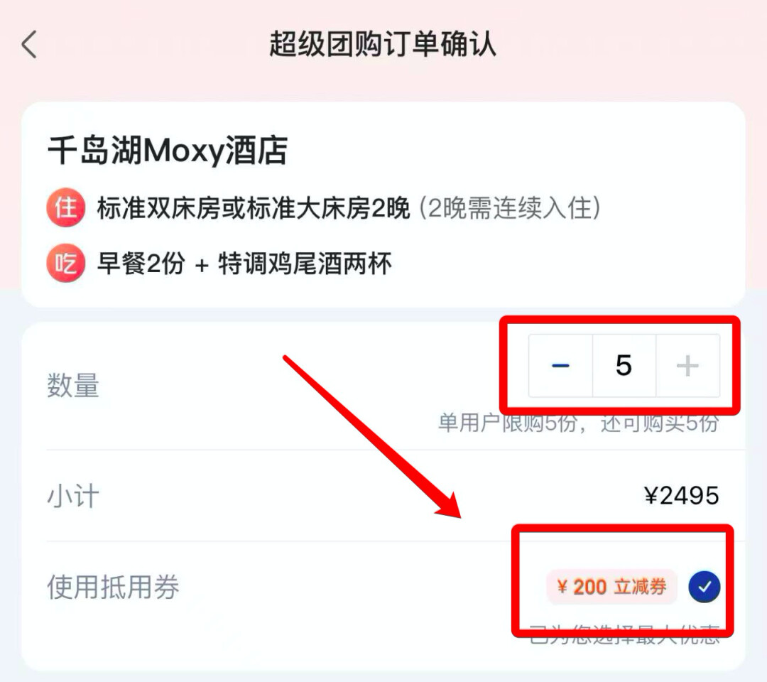 套餐拍5份,可以用满1998-200的券,券后229.5元/晚,比日历价便宜100多。