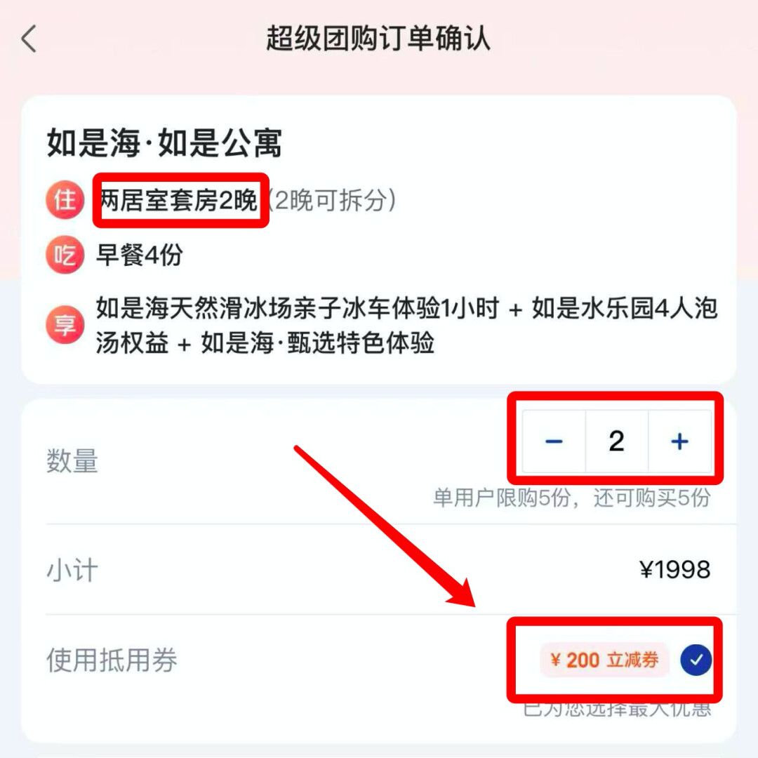 给到的是两居室套房,有两张1米8的大床,可以住4个人。套餐拍2份,可以用满1998-200的券,券后449元/晚,约为45折。