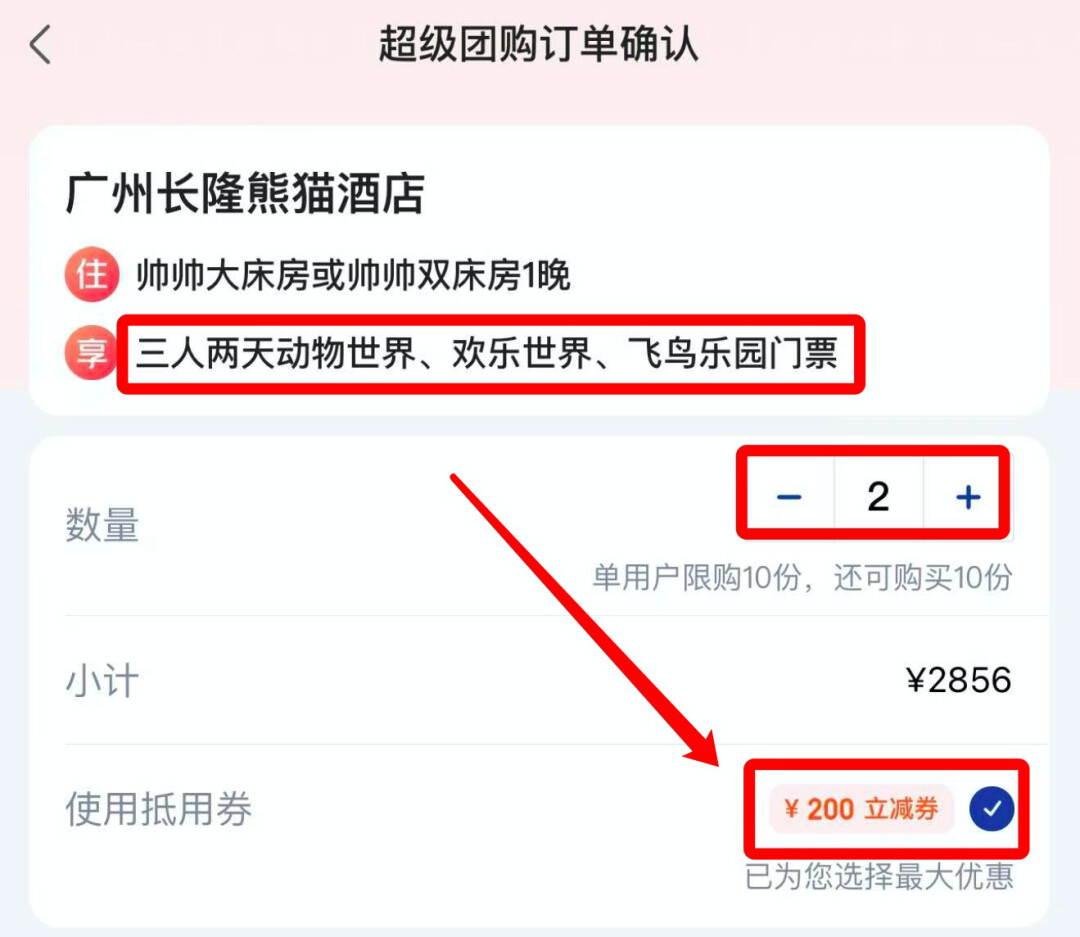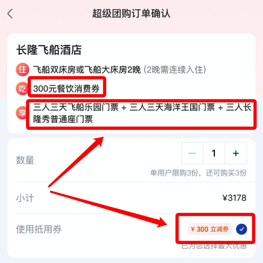 套餐可以用满2998-300的券,券后2878元/晚。价格包含了3天3人的海洋王国、飞船乐园的门票,和3人长隆秀门票,总计21张门票!