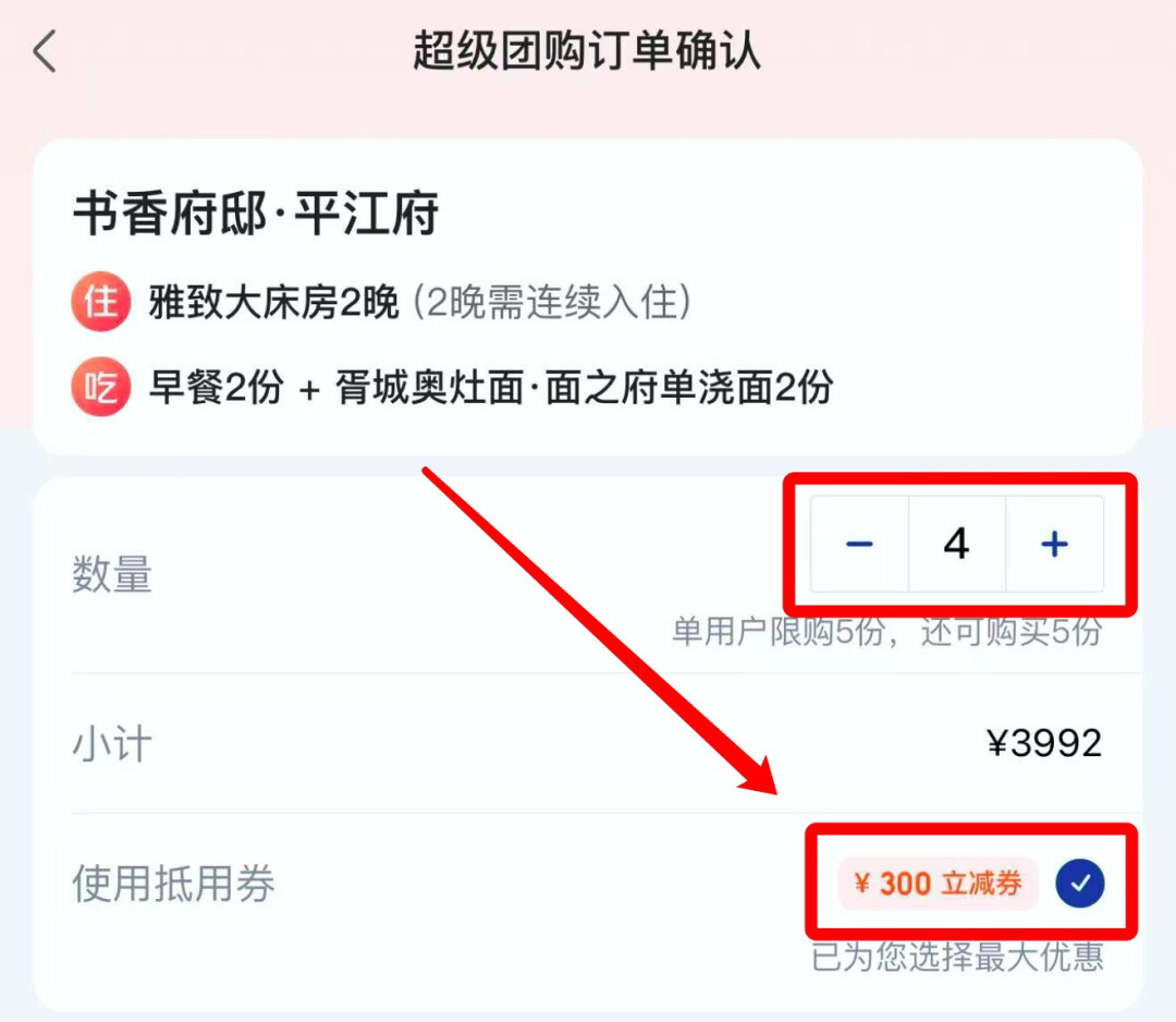 套餐拍4份,可以用满2998-300的券,券后461元/晚,约65折。还可以尝尝地道的胥城奥灶面。