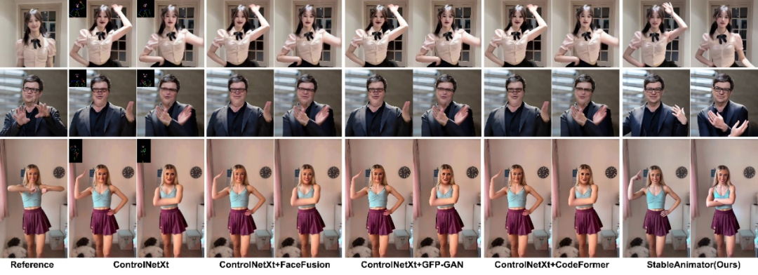 现有方法在处理面部和身体变形以及服装变化方面存在明显局限。例如,Disco、MagicAnimate、AnimateAnyone 和 Champ 在姿态转换过程中容易导致面部特征扭曲或服装结构丢失,而 Unianimate 在动作匹配方面表现良好,能够精准调整参考图像的姿态,但仍难以保证身份一致性。同时,MimicMotion 和 ControlNeXt 在保留服装细节方面具有优势,但在身份特征一致性上仍然存在缺陷。相比之下,StableAnimator 通过精确建模姿势序列驱动图像动画化,在动态生成过程中不仅保持了参考图像的身份特征完整性,而且确保了生成结果的细节准确性和生动性,充分展现了在身份一致性和高质量动画生成方面的显著优势。