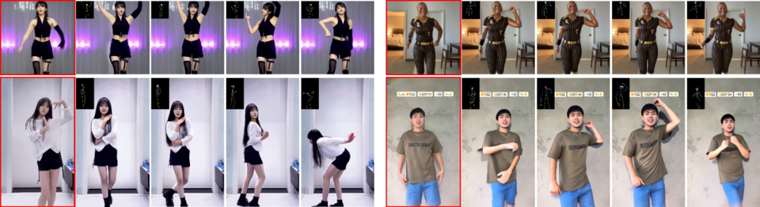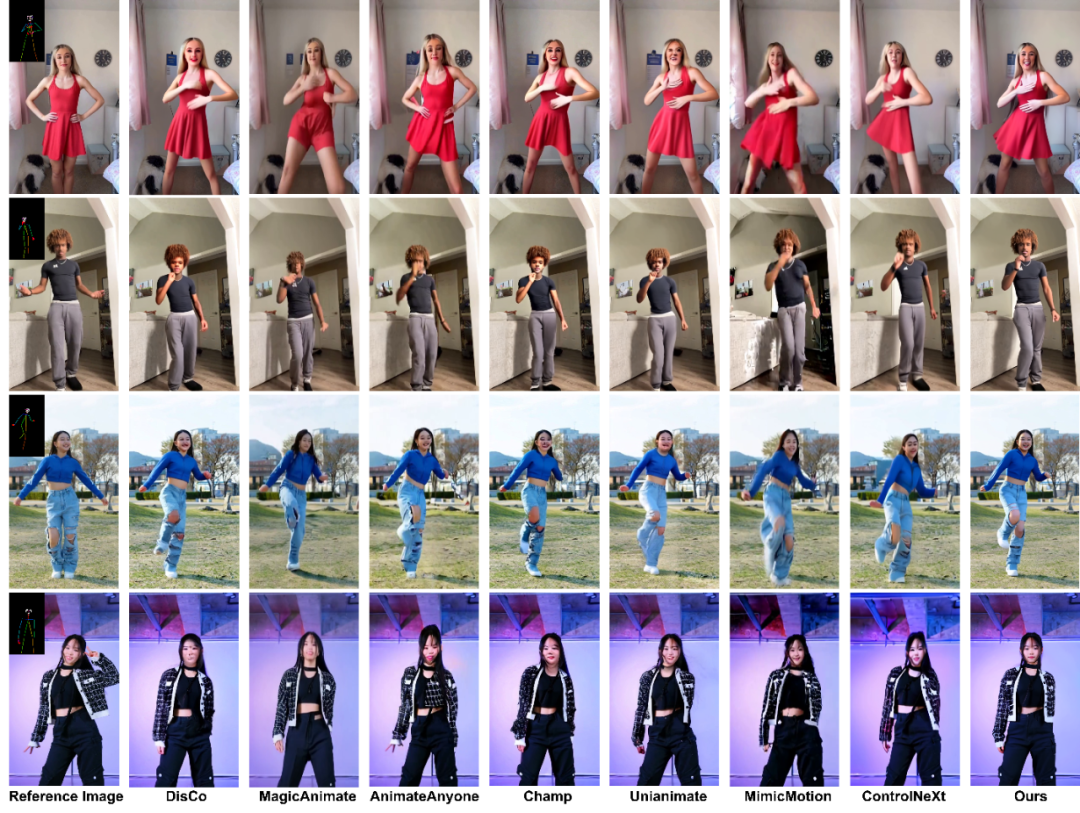 近年来,扩散模型在图像与视频合成领域展现出强大能力,为图像动画技术的发展带来了新的契机。特别是在人物图像动画方面,该技术能够基于一系列预设姿态驱动参考图像,使其动态化,从而生成高度可控的人体动画视频。此类技术在多个应用场景中展现出巨大潜力,包括:(1)影视行业:为动画制作提供高效解决方案,使虚拟角色的动画生成更加精细与便捷。(2)游戏行业:赋予游戏角色和虚拟人物自然流畅的动作表现,增强交互体验,使虚拟世界更加真实。(3)自媒体内容创作:助力短视频创作者与数字艺术家拓展创意边界,实现高度定制化的动态形象设计。