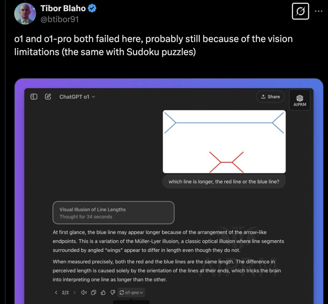 还有用户发现 o1-pro 在处理数独难题时存在困难,并且对于简单的视觉错觉笑话也容易被“绕晕”。英国计算机科学家 Simon Willison 评价每月支付 200 美元的价值在于无限制访问 o1,而非 o1-pro。