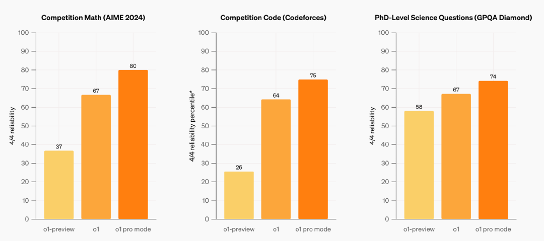 实际上,OpenAI 在相同的基准测试上进行了“更严格”的评估(只有在四次回答中全部正确,才被认为解决了该问题),以展示 o1-pro 模式的一致性。但是在这些测试中,o1-pro 的提升并不那么显著。