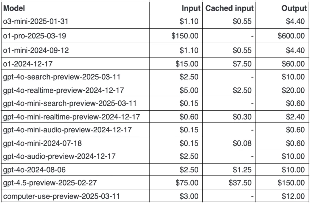 OpenAI 系列模型价格对比