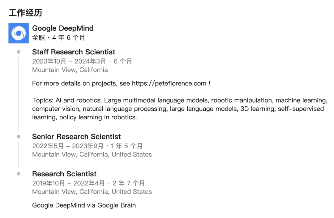 根据其领英个人资料,Florence 一年前离开了 DeepMind。他加入了 DeepMind 前同事的行列 —— 选择一条喜欢的赛道,创办自己的公司。