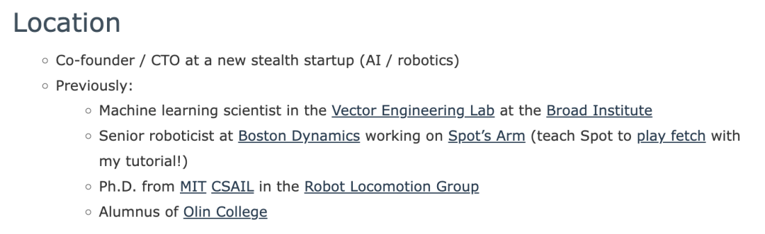 在加入谷歌之前,他在麻省理工学院获得了计算机科学博士学位,师从 Russ Tedrake。Tedrake 教授在机器人学领域有着显著的成就和广泛的影响力,研究领域包括机器人动力学分析、控制器设计和仿真等。