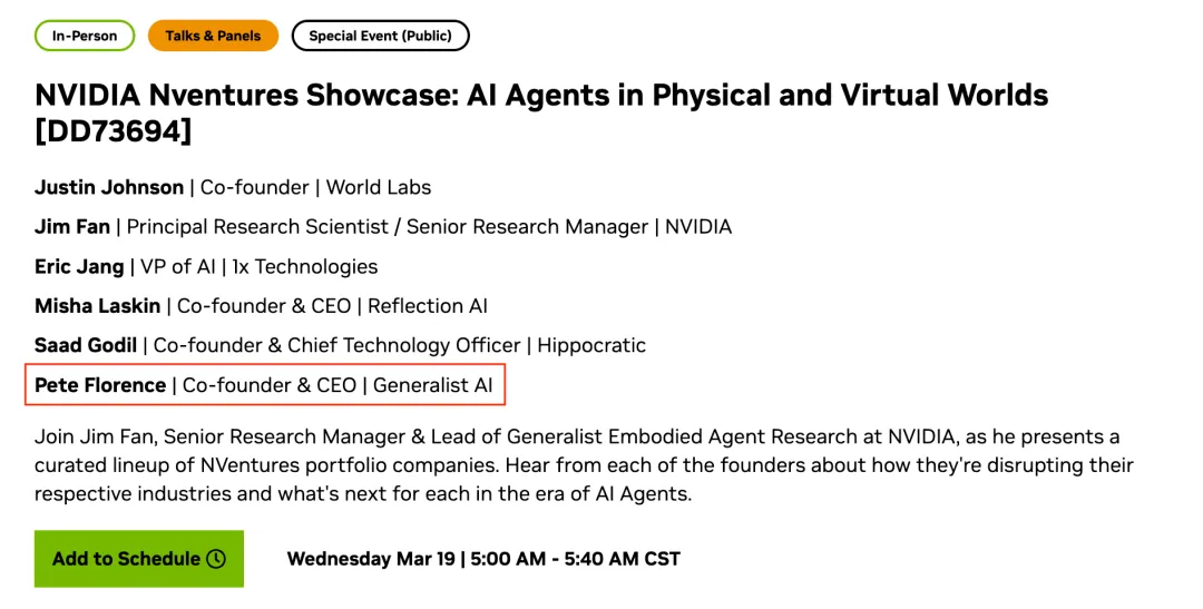 在近日召开的英伟达 GTC 的一个小组讨论会上,谷歌 DeepMind 高级研究科学家、作者 Pete Florence 以 Generalist AI 联合创始人兼首席执行官的身份出席。