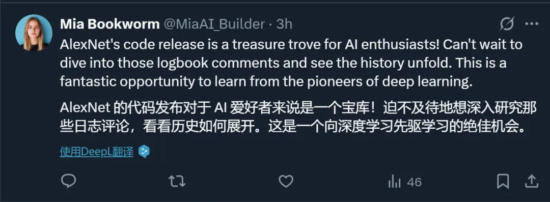 还有人说,「AlexNet 代码的发布对于 AI 爱好者来说是一个宝库,这是一个向深度学习先驱学习的绝佳机会」。