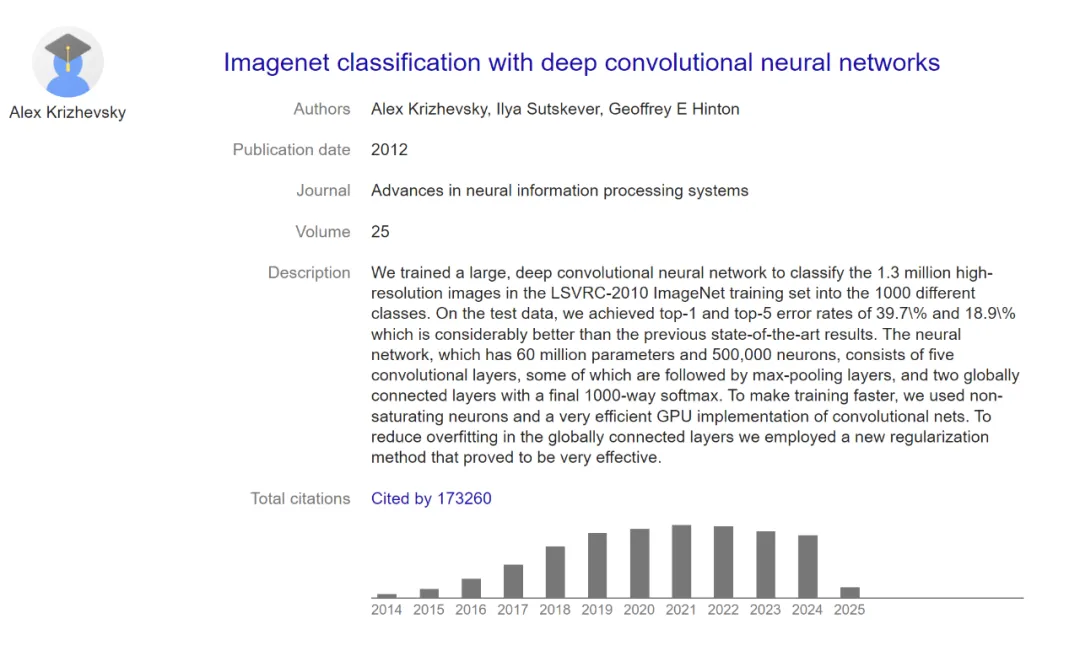 Google Scholar 数据显示,AlexNet 相关论文被引量已经超过 17 万。