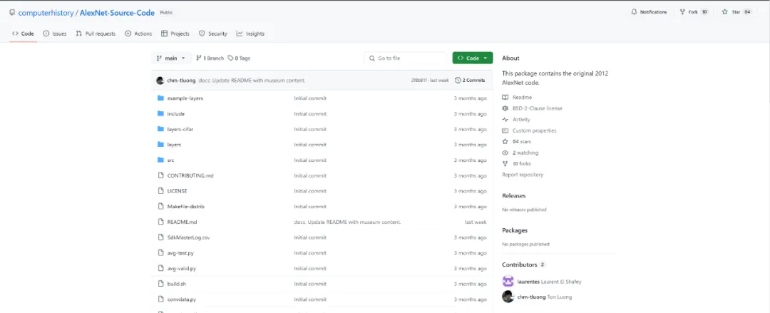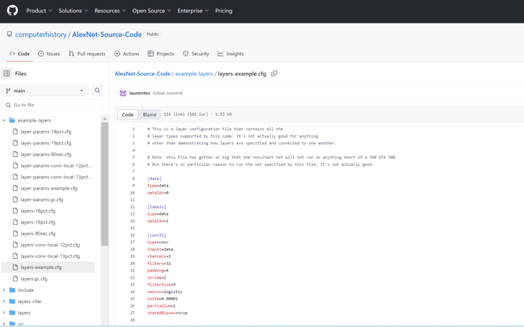CHM 发布的代码库包含了 2012 年赢得 ImageNet 竞赛时的原始 AlexNet 源代码,还包括在 ImageNet 数据集上训练的参数文件。