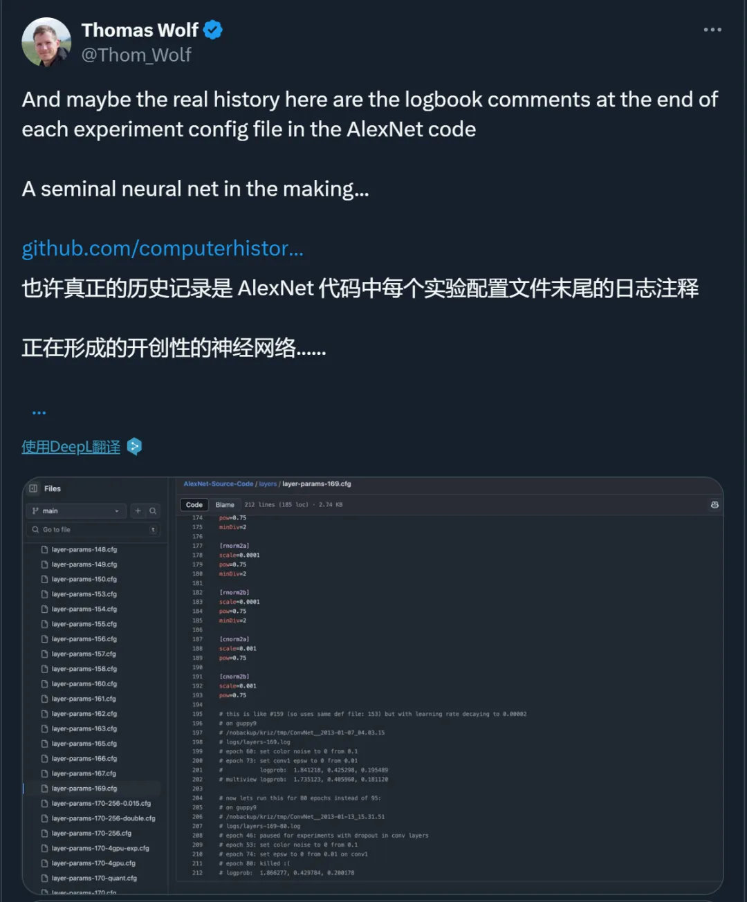 除了代码本身的价值,HuggingFace 联合创始人 Thomas Wolf 还发现,代码中的注释也非常有启发性。他说,「也许真正的历史记录是 AlexNet 代码中每个实验配置文件末尾的实验记录注释。一个开创性的神经网络正在诞生……」