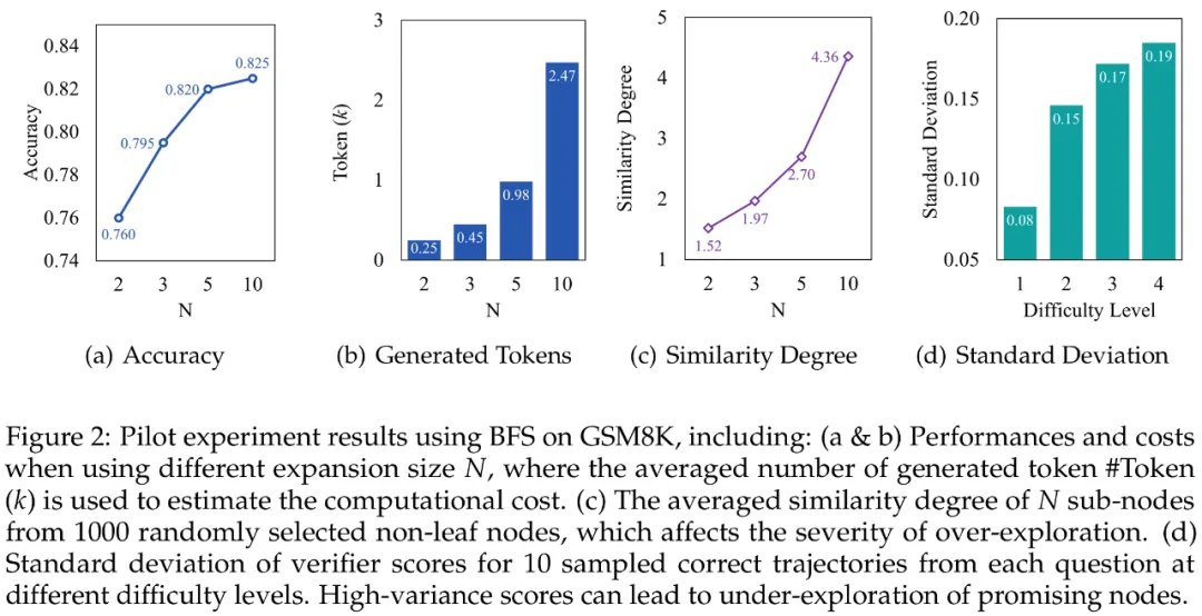 研究团队选取最佳优先搜索算法为研究对象,基于 GSM8K 数据集开展系统性研究。实验设置中逐步增加子节点拓展数(N=2,3,5,10)时发现:模型性能虽持续提升但呈现边际效益递减规律(图 a),而计算开销却呈指数级增长(图 b),二者形成的显著差异揭示出传统树搜索在推理时计算扩展的效率瓶颈。