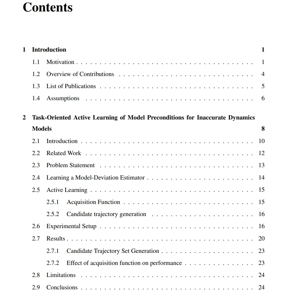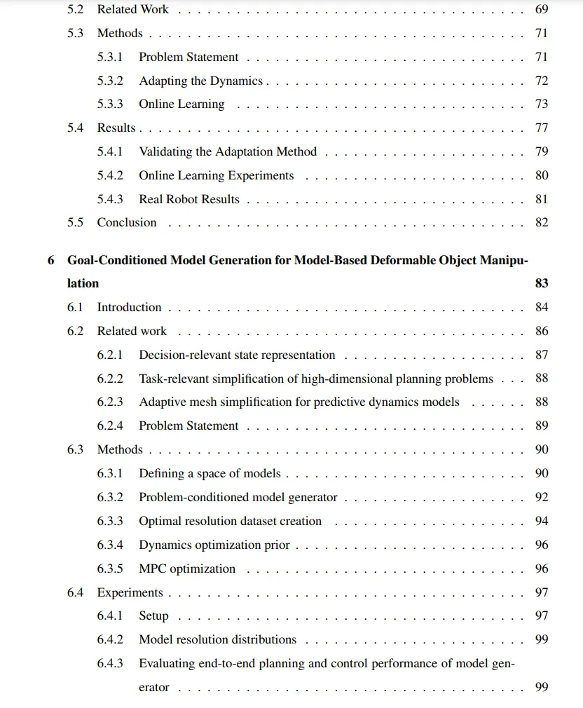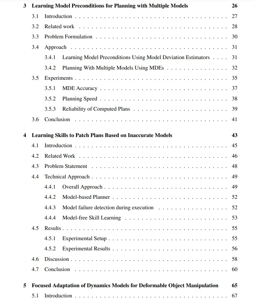 随后,论文介绍了利用模型前提条件扩展机器人能力的算法。其中一种方法支持使用多种形式不同且计算需求各异的模型进行规划,从而实现更高效的规划和可靠的执行,同时保留最优性的理论保证(第3章)。我们还解决了现有模型不足以解决问题的情况。首先,我们展示了一种将无模型技能整合到基于模型规划中的方法,且数据需求较低(第4章)。其次,我们提出了一种动力学适应算法,能够高效选择并更新学习到的动力学模型的数据,从而将能力扩展到更复杂的动力学场景(第5章)。