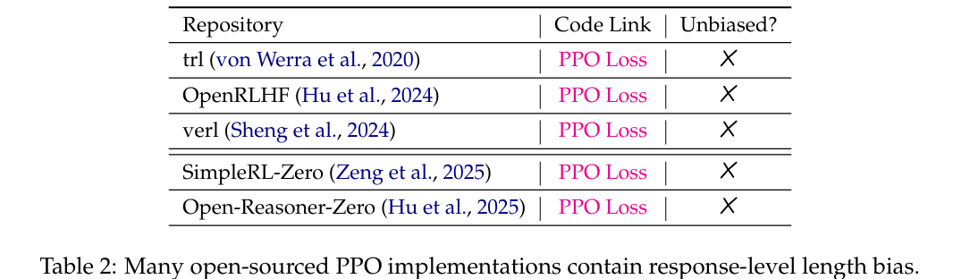 随后作者对多个流行的开源 PPO 实现进行了分析,发现这些实现无一例外地在损失函数中表现出了基于响应长度的偏差(详见附录 1 和表 2)。