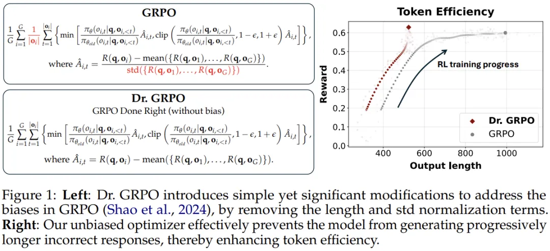 在第二部分中,人们确定了 GRPO 优化中的偏差,这可能会导致错误响应逐渐变长。为此,研究人员提出了一个简单的解决方案,可以在保持推理性能的同时提高 token 效率,称为 Dr. GRPO(GRPO Done Right)(图 1 中显示)。