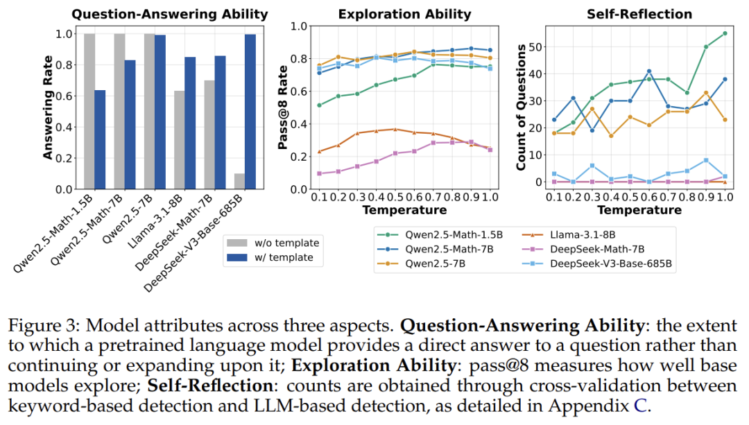 图 3 的中图显示了不同基础模型(使用模板)在不同采样温度下的 pass@8 准确度。该指标可以作为基础策略探索能力的指标。例如,如果基础策略甚至无法采样出一条通向正确最终答案的轨迹,那么由于没有奖励信号,强化学习就不可能改进该策略。他们的结果表明,所有测试的模型都具有探索性(因此已准备好进行强化学习),其中 Qwen2.5 模型表现最佳(甚至超越了 DeekSeek-V3-Base)。这可能部分解释了为什么大多数 R1-Zero 项目都基于 Qwen2.5 模型。