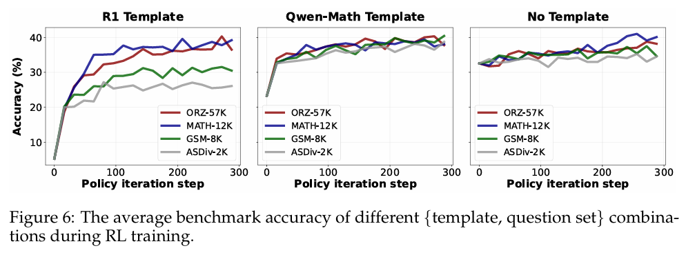Qwen2.5-Math-1.5B 基础模型已具备较强的数学解题能力(见图 6 右图的起点),模板的使用反而会破坏这一能力,直到 RL 重建。因此这说明在强调纯 RL 带来的巨大收益时应更加谨慎。
