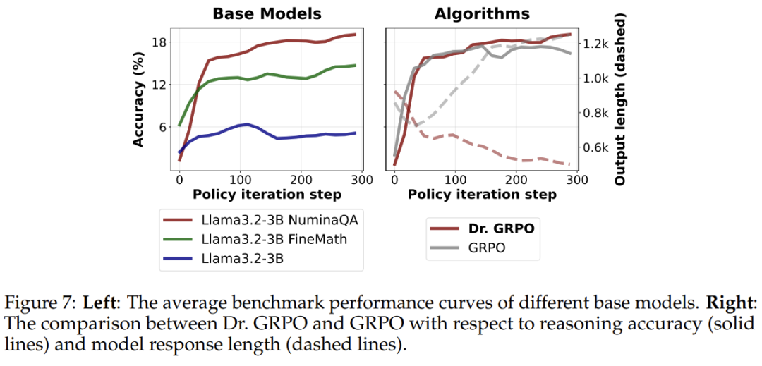 作者还使用 Llama 基础模型重新审视了 GRPO 的优化偏差。图 7 的右图比较了使用 GRPO 和 Dr. GRPO 训练的模型性能和回答长度,可以清楚地看到,GRPO 可以产生「双重增加」现象,可能导致误解,即在数学预训练后,长思维链(long-CoT)也能在 Llama 模型上出现。然而,长度的增加可能是由于优化偏差,而这种偏差可以通过他们提出的 Dr. GRPO 有效缓解(图 7 的右图)。
