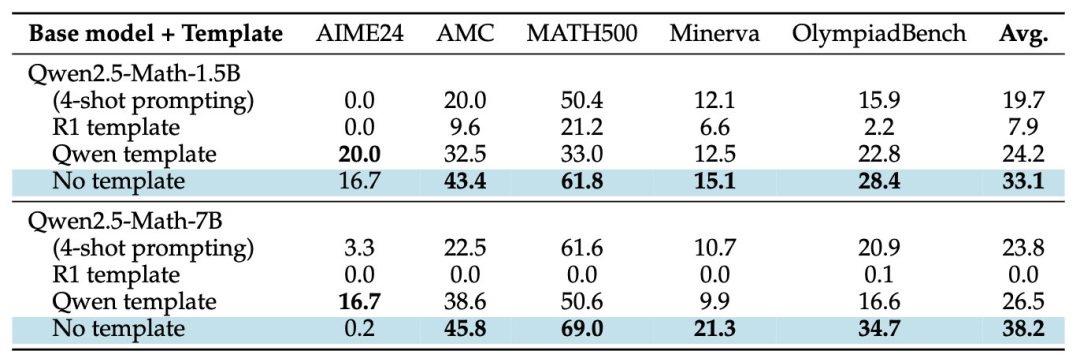 有趣的是,Qwen-2.5 基础模型在不使用模板时立即获得约 60% 的提升,这让研究人员假设它们可能在训练模型时对拼接的问答文本进行了预训练;