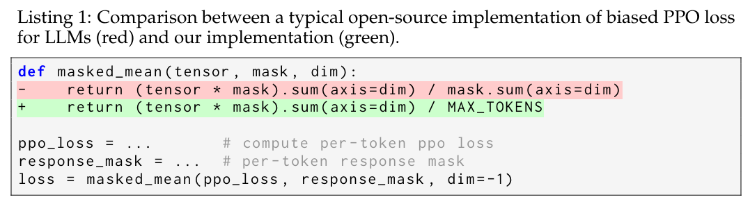 同时,为确保优化目标的无偏性,研究在 Listing 1 的掩码均值函数中将 mask.sum (axis=dim) 替换为一个固定值 MAX_TOKENS,具体如绿色高亮部分所示。