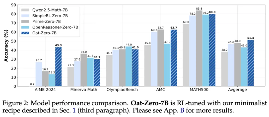 他们对基础模型和强化学习的分析表明,实现类似 R1-Zero 训练可采用极简方案:利用无偏的 Dr. GRPO 算法,以 Qwen-Math 模板对 Qwen2.5-Math-7B 模型进行强化学习调优,使用 MATH 3-5 级问题作为训练数据,仅用 8 块 A100 GPU 训练 27 小时,就实现了最先进的性能(图 2 展示)。