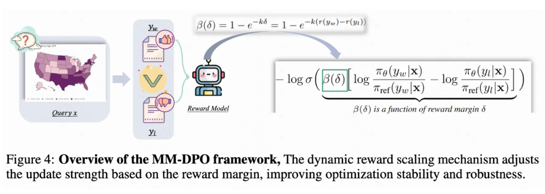 为了解决这个问题,MM-DPO 引入了动态奖励缩放(Dynamic Reward Scaling)机制,根据奖励差距动态调整更新强度,优先利用高置信度的样本对。具体而言,奖励模型可以自然地为样本对提供奖励差距(reward margin),这为动态控制样本的更新权重提供了一个直接的信号。